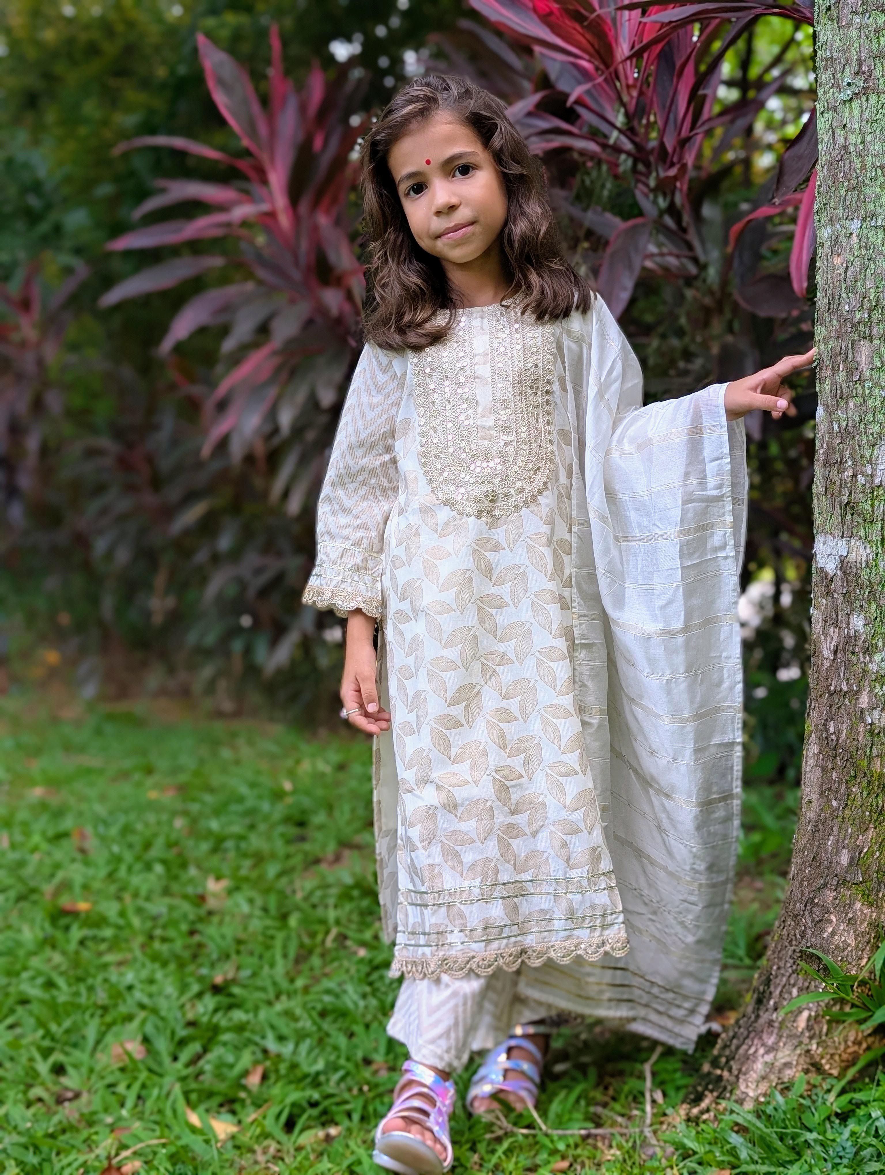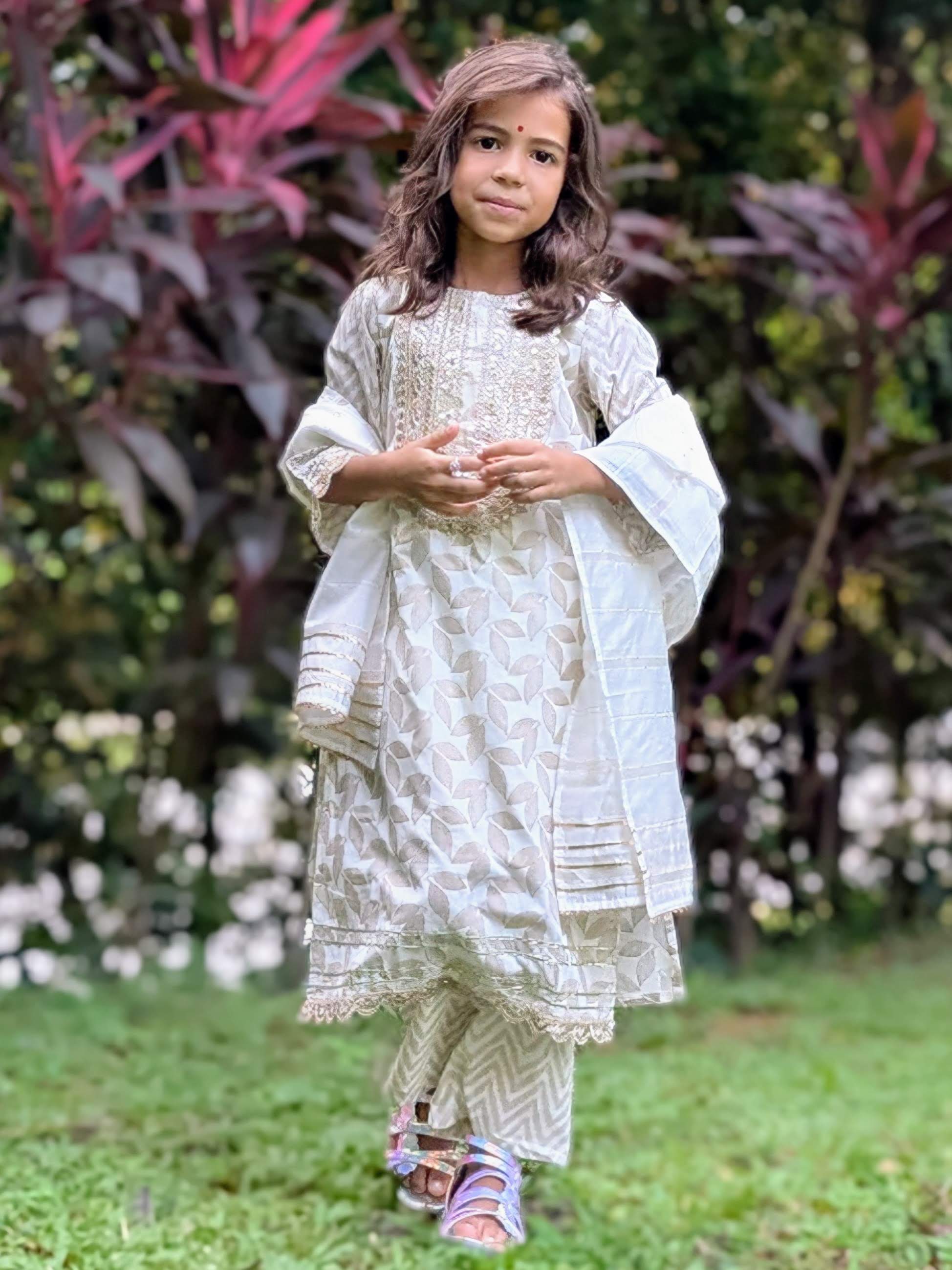 Dress your little girls in the elegance of the Zoya White & Gold Kurta Salwar, crafted from soft cotton and designed to exude grace and style. Combines the purity of white with the regal touch of gold accents, making this both timeless and sophisticated.