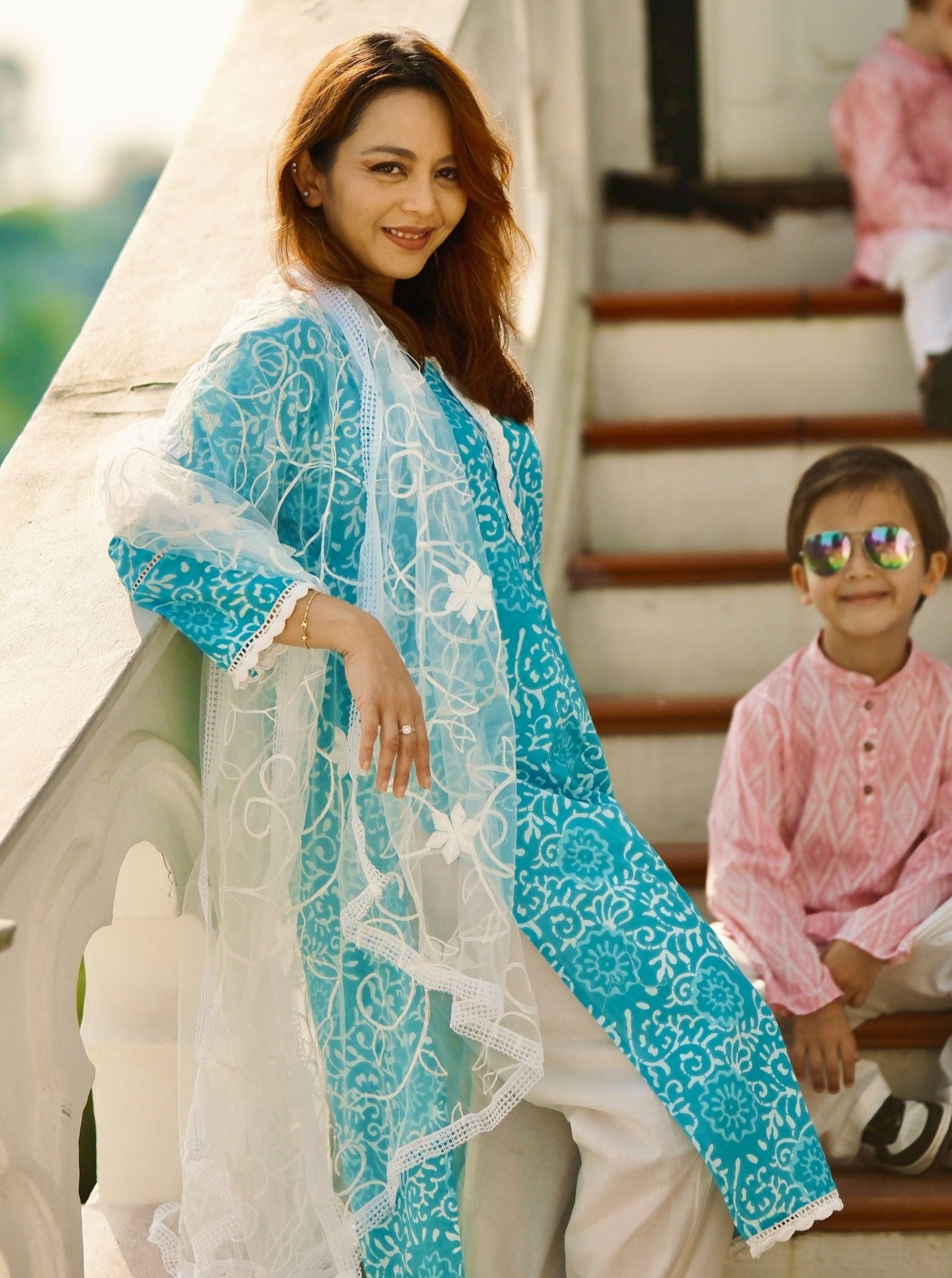 'Meher' Women's Blue Kurti, Pants with Lace Work and Embroidered White Net Dupatta Set