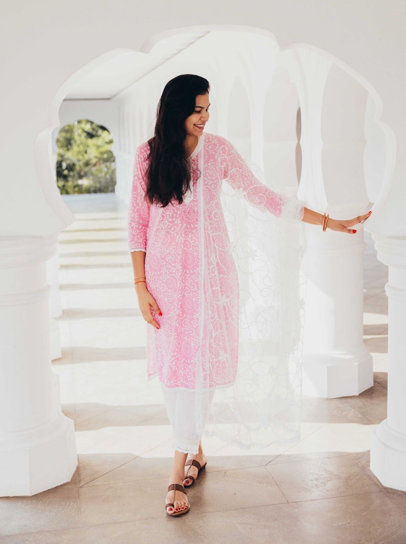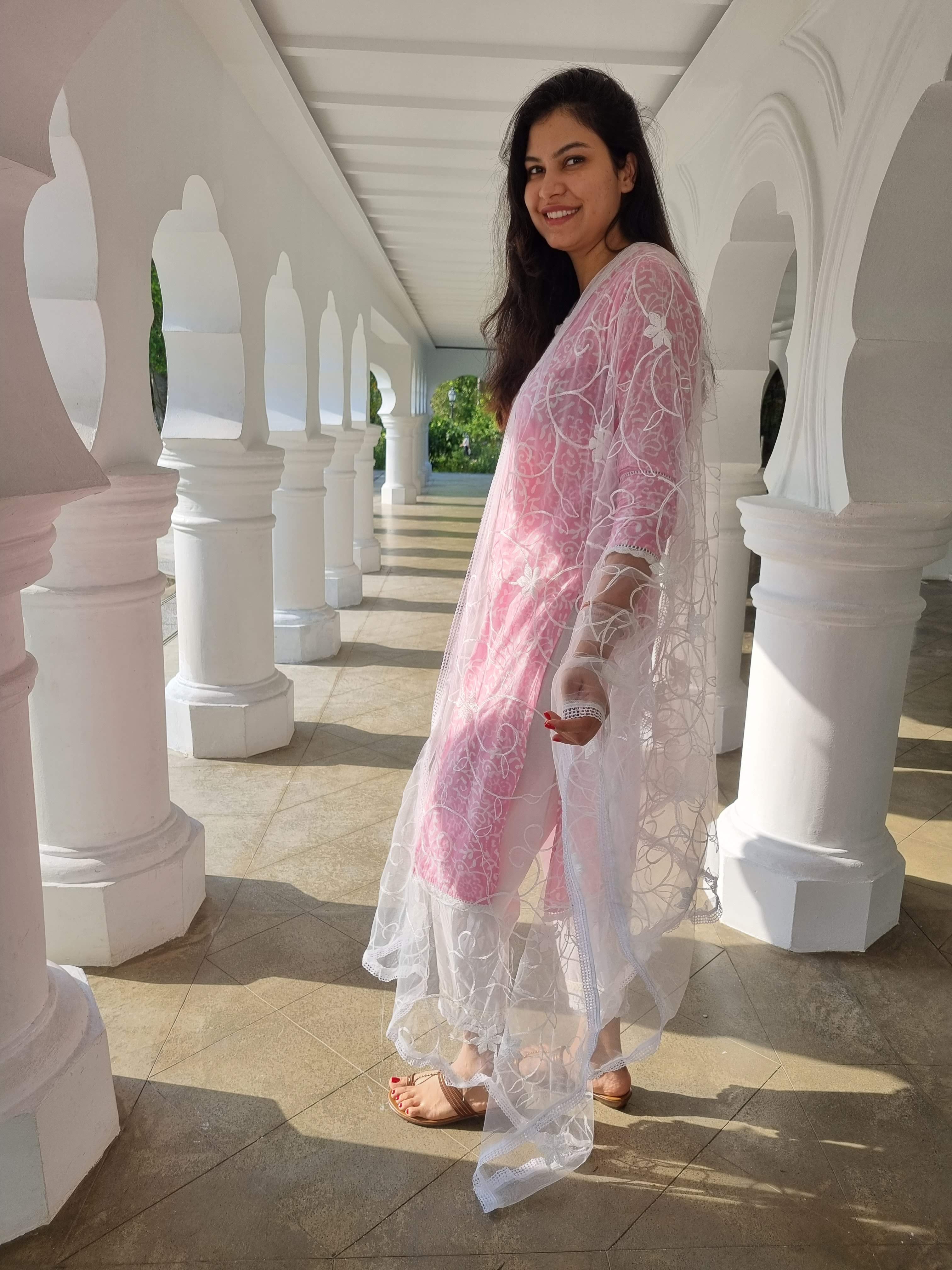 'Meher' Women's Pink Kurti, Pants with Lace Work and Embroidered White Net Dupatta Set