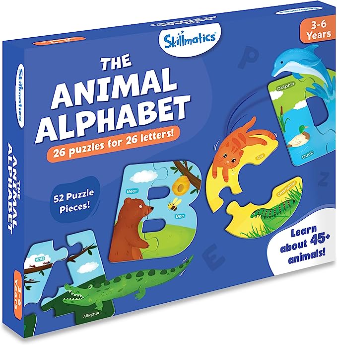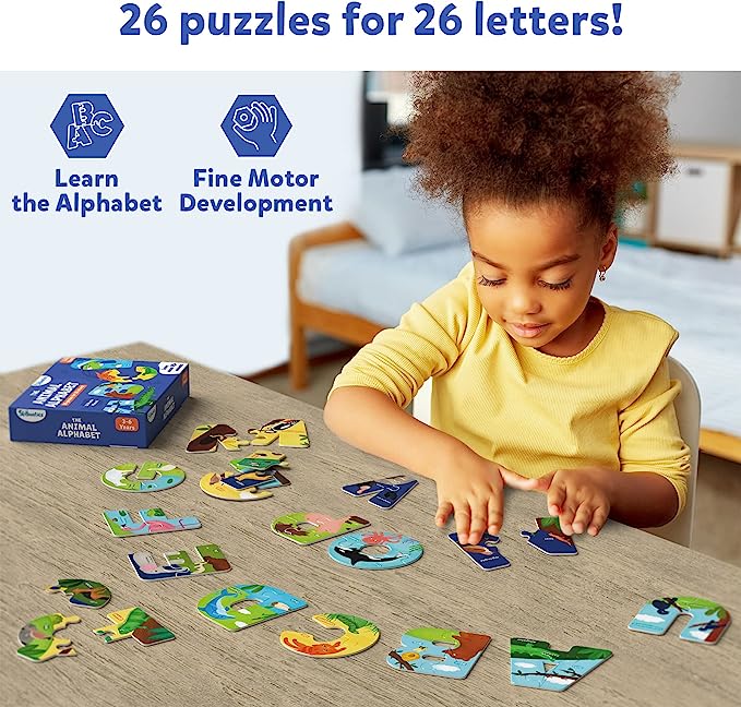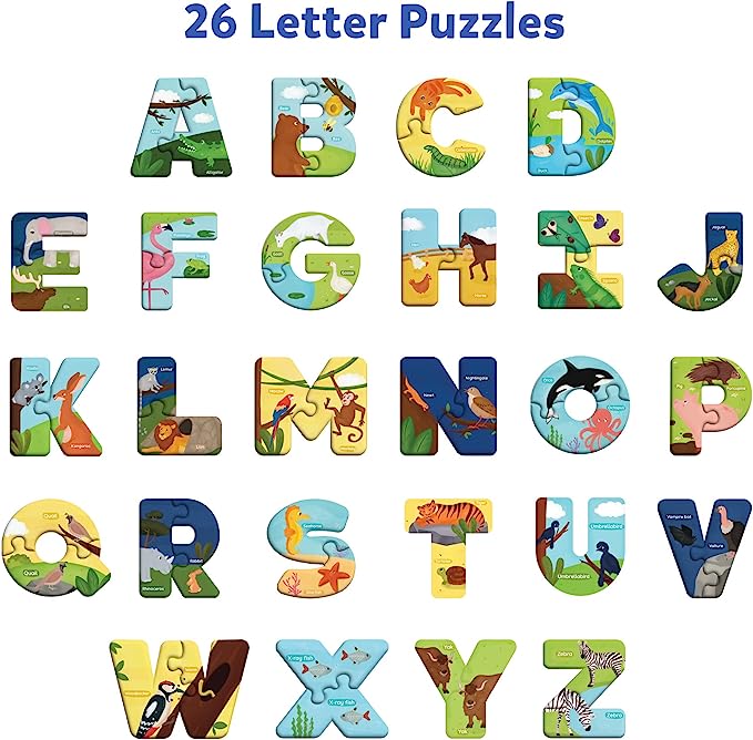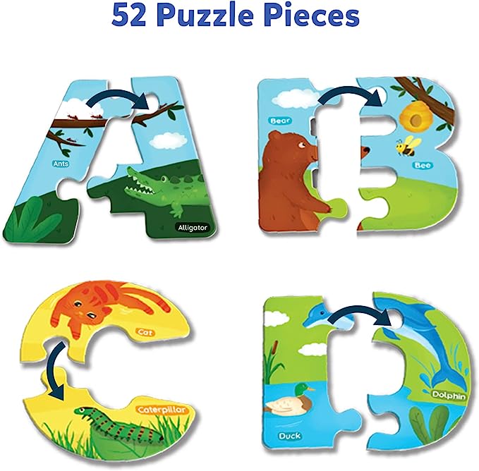 - 26 MINI PUZZLES FOR PRESCHOOLERS - The Animal Alphabet puzzle set includes 52 extra-thick cardboard pieces that are easy for children to put together. Once the puzzles are completed, they display 26 colorful uppercase letters that feature over 45 animals!