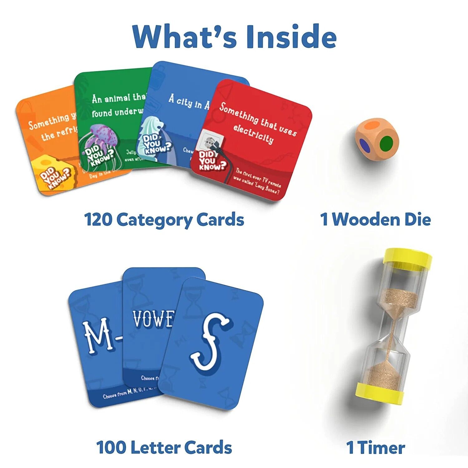 - INCLUDES - 120 Category Cards, 100 Letter Cards, 1 Wooden Die, 1 Timer & Instruction Manual