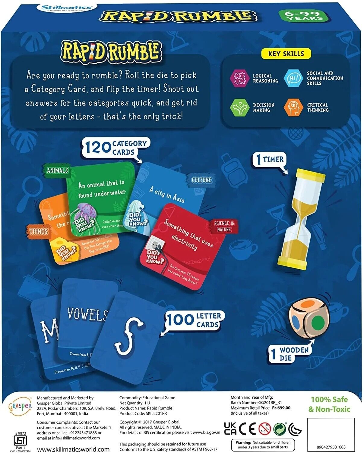 - SUPER FUN CATEGORY GAME - Rapid Rumble is the fastest, funniest and cleverest category game! Roll the die, set the timer, and get ready to rumble! Quickly shout out answers for the categories and be the first one to finish your deck of Letter Cards. Discover Animals, Things, Culture, Science and Nature with 120 category cards as you play this exciting game!