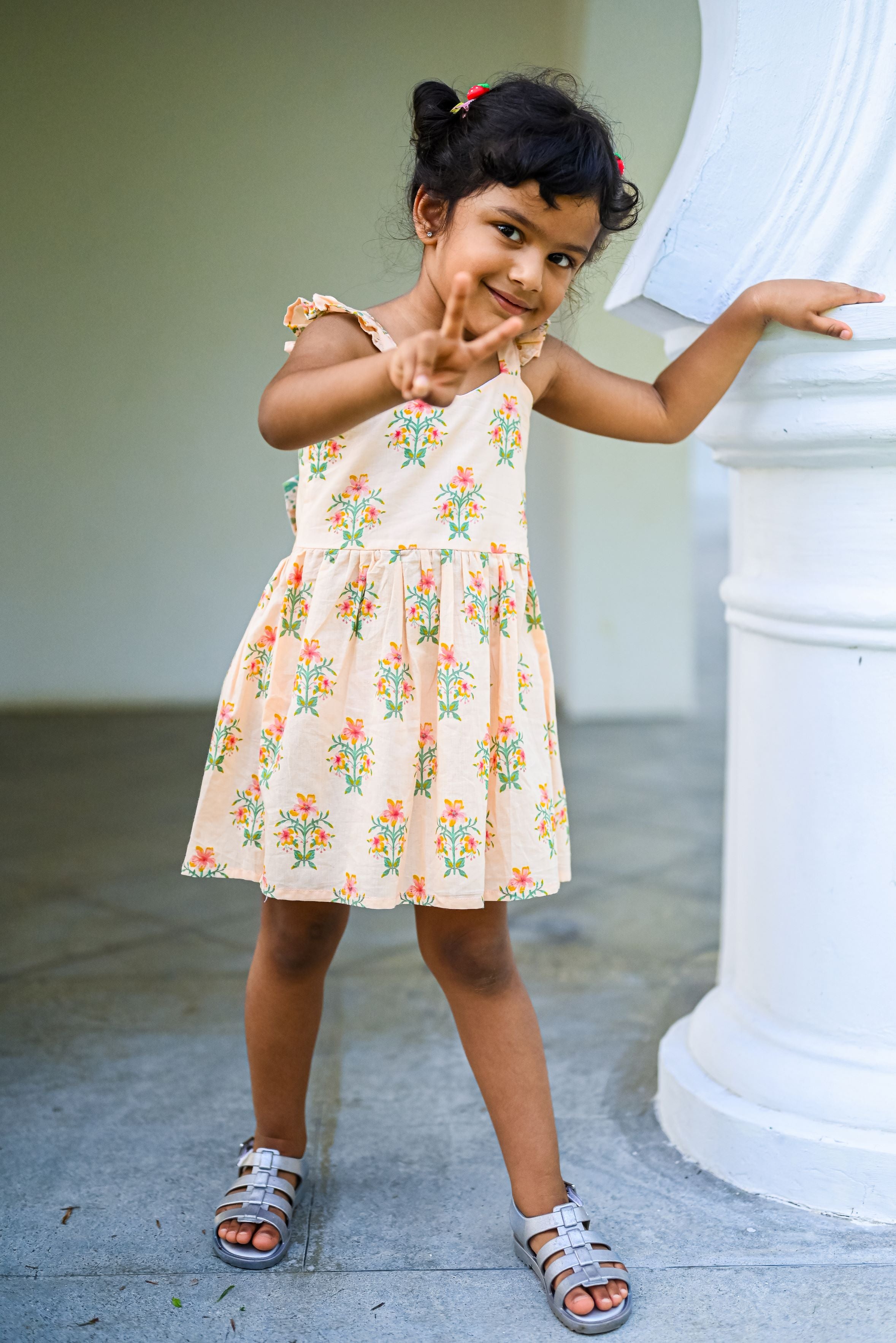 With all the flowers and bouquets in all the happy colours, the peach party print is a garden! Printed on 100% premium cotton, the frock has a flared shape with a gathered hem - adding all the bounce and flounce, and falls just above the knee. It has a gorgeous bow at the back to add all the oomph.