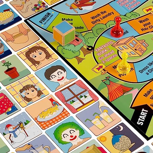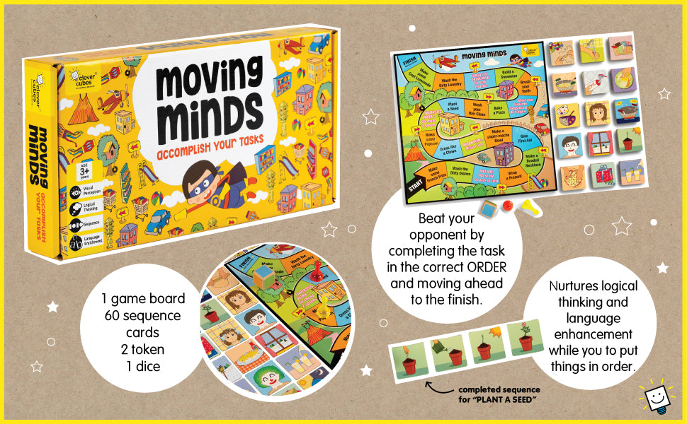 - A colourful game board with instructions needed to complete the given sequence happening in daily life. It nurtures the child's logical thinking and language skills.