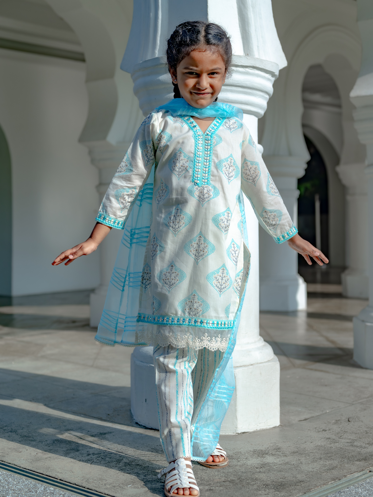 Gul Blue Girls Kurti with Pants Set in Cotton with Net Dupatta